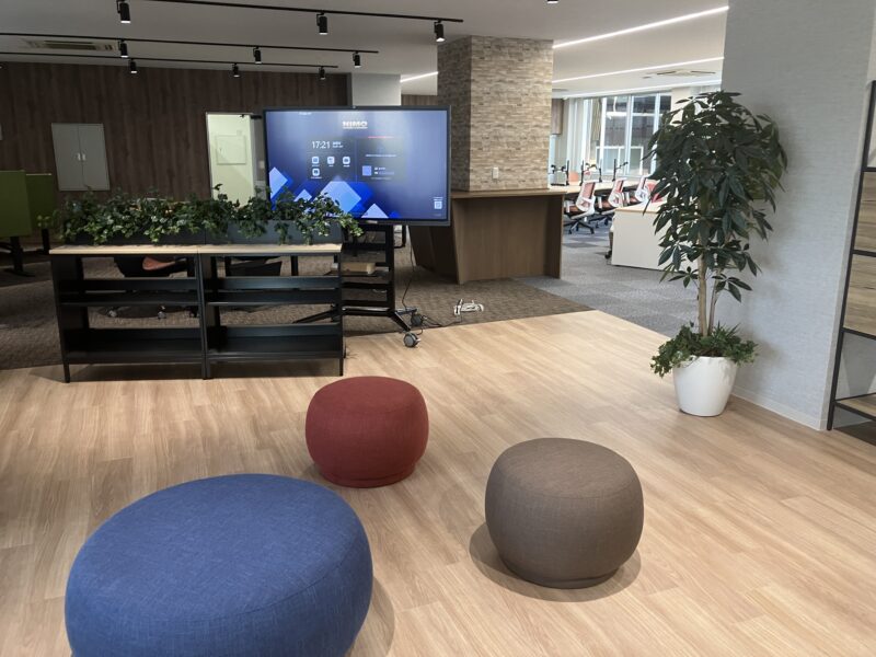• MAXHUB(マックスハブ)も65インチサイズで設置させていただき、ミーティング利用だけでなく、サイネージとしても活用できます! 次は、奥に見えているのが 執務エリア です~